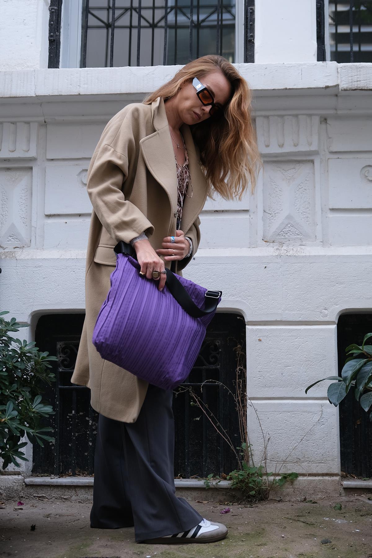 Bu tarz bir çanta, hem casual kombinlerle hem de daha şık görünümlerle kolayca uyum sağlayabilir. Mor rengiyle cesur ve sofistike bir dokunuş ekleyerek kombininizi tamamlamaktadır.
